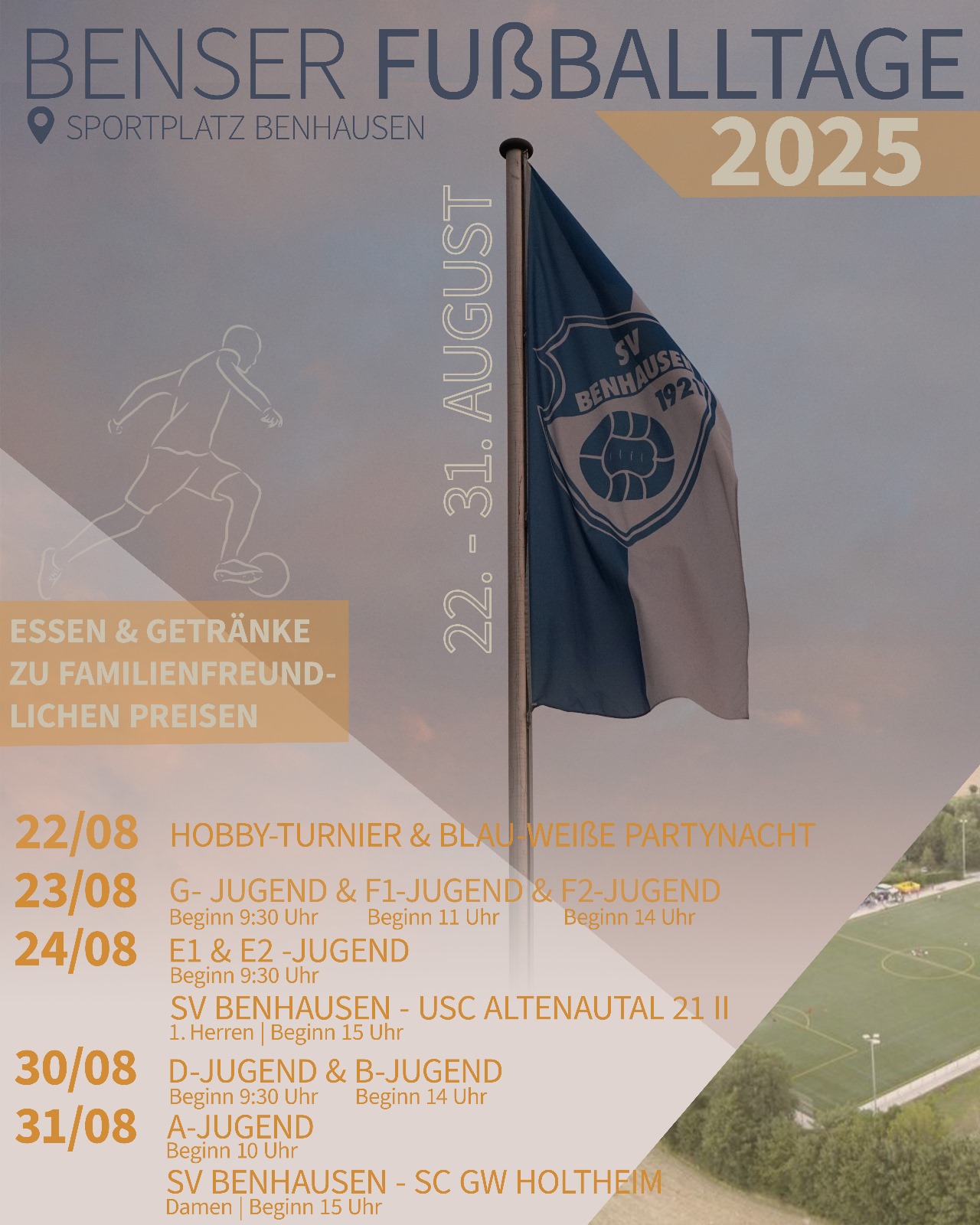 Benser Fußballtage 2025 (Hobby-Turnier & Blau-Weiße-Partynacht) Wann Freitag, 22. August 2025 Ganztägig Zum Kalender hinzufügen ICS herunterladen Google Kalender iCalendar Office 365 Outlook Live Wo Sportplatz Benhausen Am Sportplatz 19-21, Paderborn, 33100 Veranstaltungstyp Fußball