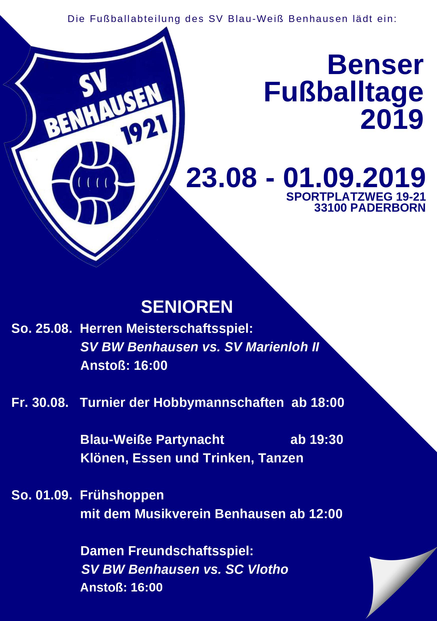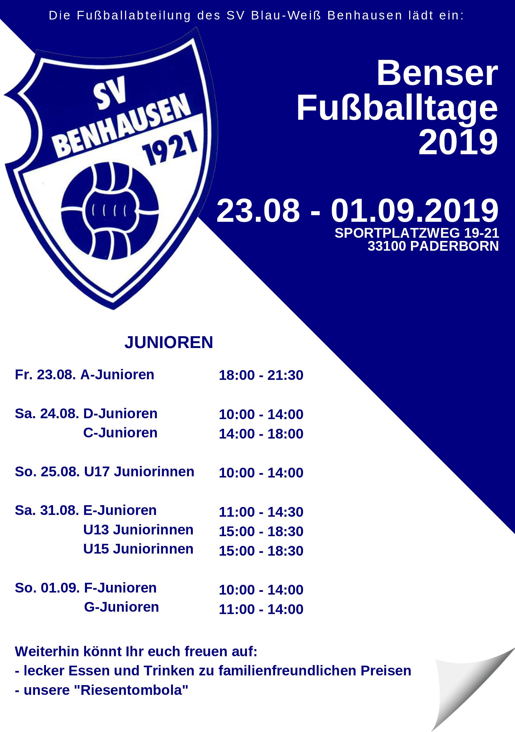 « Alle Veranstaltungen Diese Veranstaltung hat bereits stattgefunden. Benser Fußballtage 2019 23. August 2019 - 1. September 2019 « Trimm Trab ins Grüne am 1. Mai Spiel der A-Junioren » Zum Kalender hinzufügen Google Kalender iCalendar Outlook 365 Outlook Live Details Beginn: 23. August 2019 Ende: 1. September 2019 Veranstaltungsort Sportplatz Benhausen Sportplatzweg 19-21 Paderborn, Nordrhein-Westfalen 33100 Google Karte anzeigen Veranstalter Fußballabteilung SV Blau-Weiß Benhausen