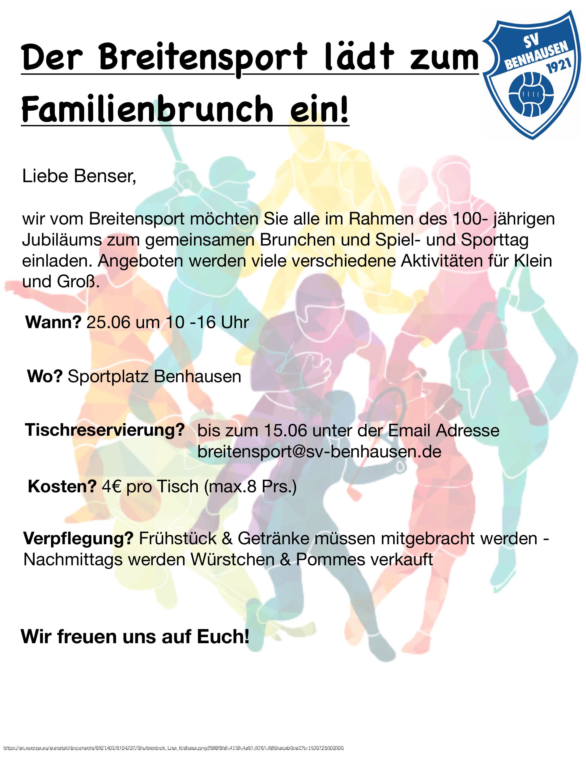 « Alle Veranstaltungen Diese Veranstaltung hat bereits stattgefunden. Familienbrunch 25. Juni 2022,10:00 - 16:00 « Generalversammlung des SV Blau-Weiß Benhausen SVB Sommerparty 2022 » Zum Kalender hinzufügen Google Kalender iCalendar Outlook 365 Outlook Live Details Datum: 25. Juni 2022 Zeit: 10:00 - 16:00 Veranstaltungsort Sportplatz Benhausen Sportplatzweg 19-21 Paderborn, Nordrhein-Westfalen 33100 Google Karte anzeigen Veranstalter Breitensportabteilung